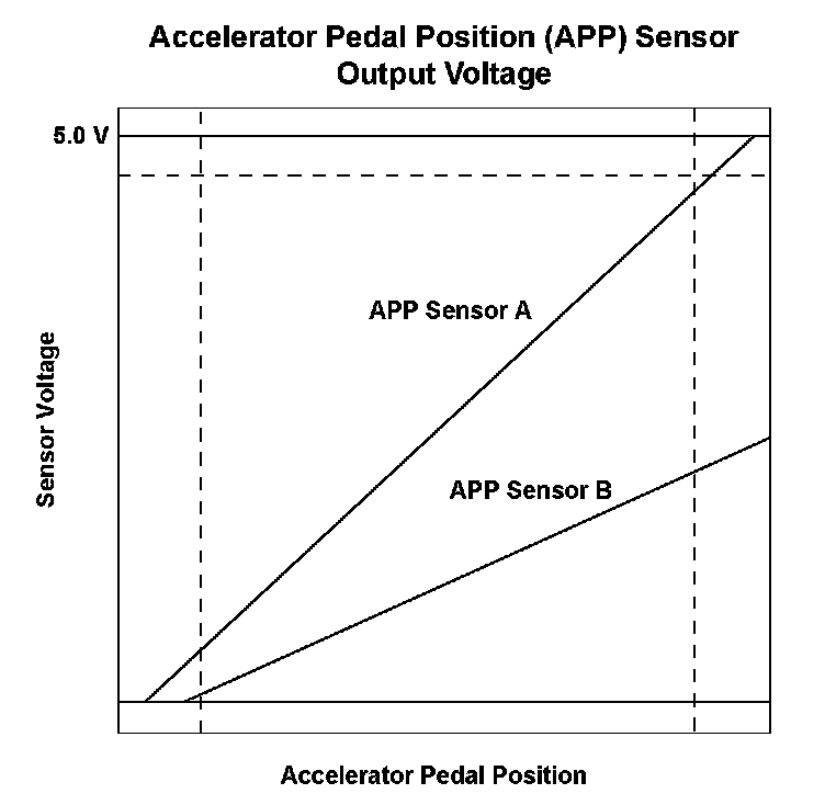 Accelerator pedal position (APP) sensor A and accelerator pedal position (APP) sensor B are potentiometers. They are installed on the accelerator pedal. When the accelerator pedal is pressed, APP sensors A and B detect the accelerator opening value. The accelerator pedal opening value is converted to a signal in APP sensors A and B and transmitted to the engine control module (ECM)/powertrain control module (PCM) to compute the target position. APP sensor A is for the primary control, and APP sensor B is a back-up of APP sensor A in case it malfunctions. Both sensors compare their output voltage to each other for malfunction detection. When the voltage difference of APP sensor B is out of a fixed range for a set time, the ECM/PCM detects a malfunction and stores a DTC.