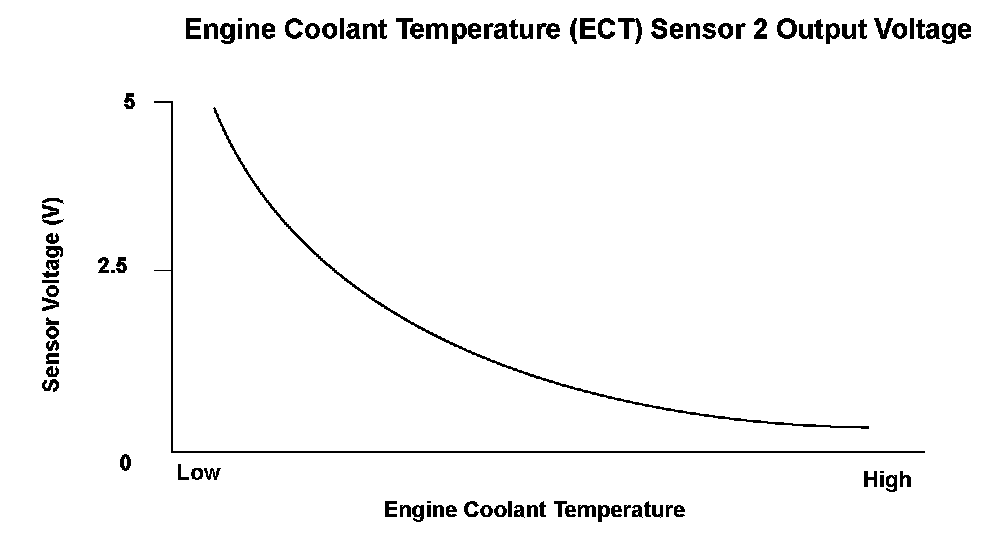 Engine coolant temperature (ECT) sensor 2 is a thermistor attached to the water passage. The engine control module (ECM)/powertrain control module (PCM) applies voltage (about 5 V) to the ECT2 signal circuit through a pull-up resistor. As the engine coolant temperature cools, ECT sensor 2 resistance increases, and the ECM/PCM detects a high signal voltage. As the engine coolant warms, the sensor resistance decreases, and the ECM/PCM detects a low signal voltage. If the ECT sensor 2 output voltage is a set value when the engine coolant temperature is low, the ECM/PCM detects a malfunction and stores a DTC.