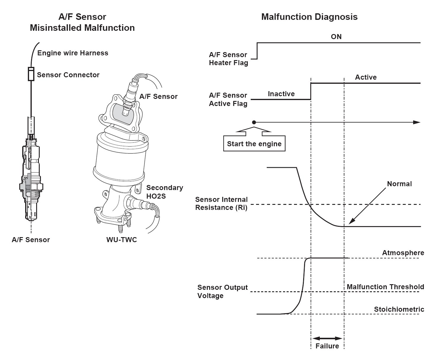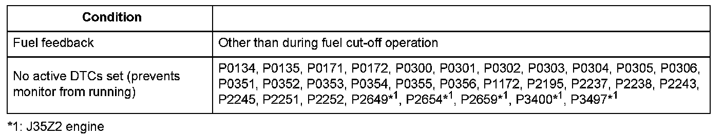 When the rear air/fuel ratio (A/F) sensor (bank 1, sensor 1) is properly connected to the engine wire harness, but it is not installed in the exhaust pipe, the A/F feedback is not done properly even if the rear A/F sensor is active after starting the engine. Thus, the exhaust emissions increase. When the rear A/F sensor output stays out of the normal range after the rear A/F sensor becomes active, the engine control module (ECM)/powertrain control module (PCM) detects that the rear A/F sensor is not properly installed and a DTC is stored.