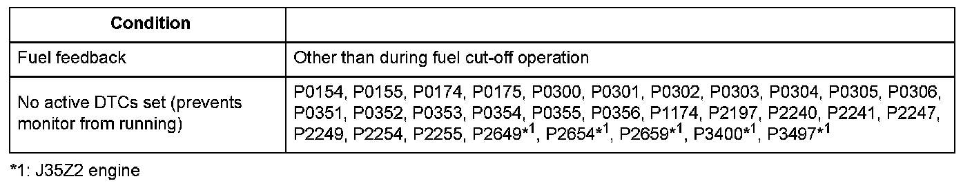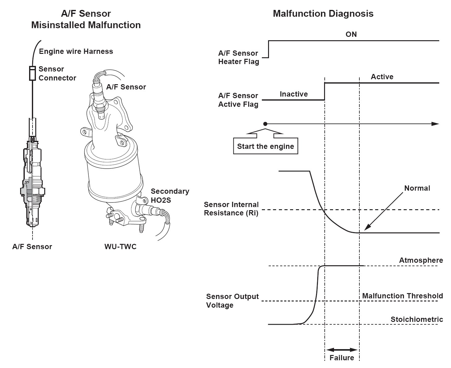 When the front air/fuel ratio (A/F) sensor (bank 2, sensor 1) is properly connected to the engine wire harness, but it is not installed in the exhaust pipe, the A/F feedback is not done properly even if the front A/F sensor is active after starting the engine. Thus, the exhaust emissions increase. When the front A/F sensor output stays out of the normal range after the front A/F sensor becomes active, the engine control module (ECM)/powertrain control module (PCM) detects that the front A/F sensor is not properly installed and a DTC is stored.