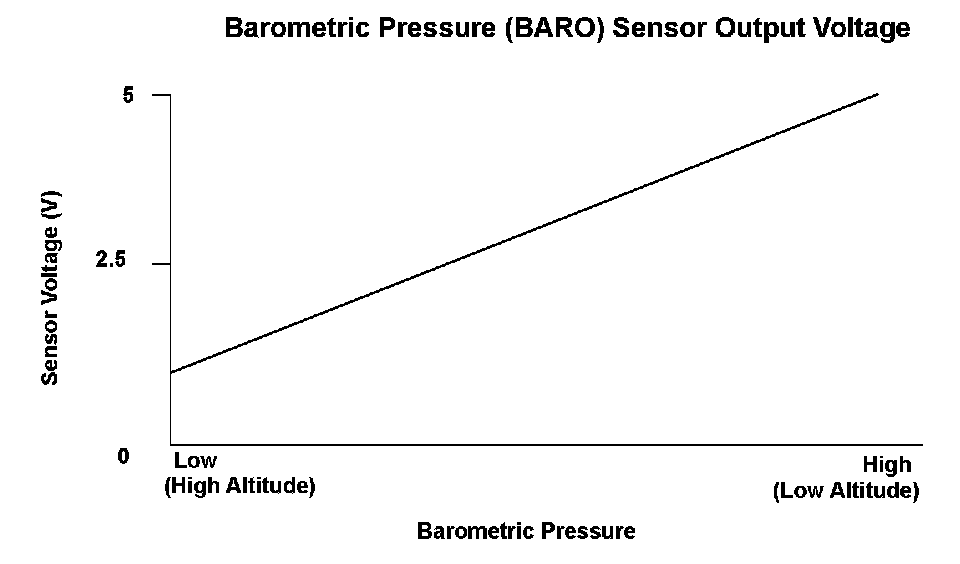 The barometric pressure (BARO) sensor is built into the engine control module (ECM) and monitors atmospheric pressure. When the throttle valve is wide open, the manifold absolute pressure (MAP) sensor output is nearly equal to the BARO sensor output. If the throttle position is beyond a value stored in the ECM that is used to detect "wide-open throttle," and if the difference between the MAP sensor output and the BARO sensor output is equal to or greater than a set value, the ECM detects a malfunction in the BARO sensor output and stores a DTC.
