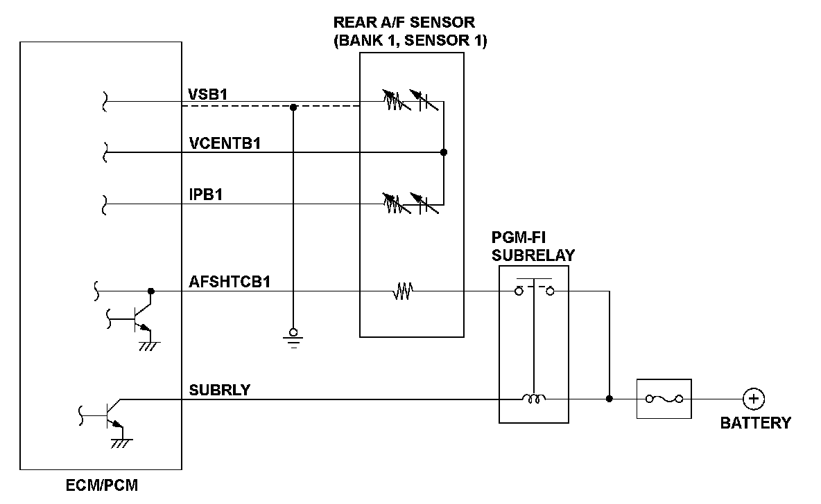 The rear air/fuel ratio (A/F) sensor (bank 1, sensor 1) is installed in the exhaust manifold and detects oxygen content in the exhaust gas. The rear A/F sensor transmits a signal to the engine control module (ECM)/powertrain control module (PCM), and it enables overall feedback control. The ECM/PCM controls fuel injection duration by comparing the target air/fuel ratio with the rear A/F sensor signal. If the IPB1 terminal voltage is out of a specified range, the ECM/PCM detects a malfunction and stores a DTC.