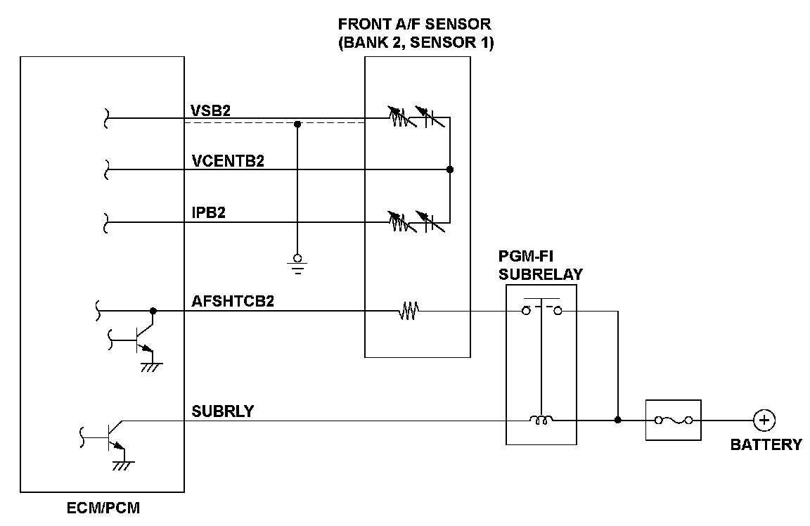 The front air/fuel ratio (A/F) sensor (bank 2, sensor 1) is installed in the exhaust manifold and detects oxygen content in the exhaust gas. The front A/F sensor transmits a signal to the engine control module (ECM)/powertrain control module (PCM), and it enables overall feedback control. The ECM/PCM controls fuel injection duration by comparing the target air/fuel ratio with the front A/F sensor signal. If the IPB2 terminal voltage is out of a specified range, the ECM/PCM detects a malfunction and stores a DTC.