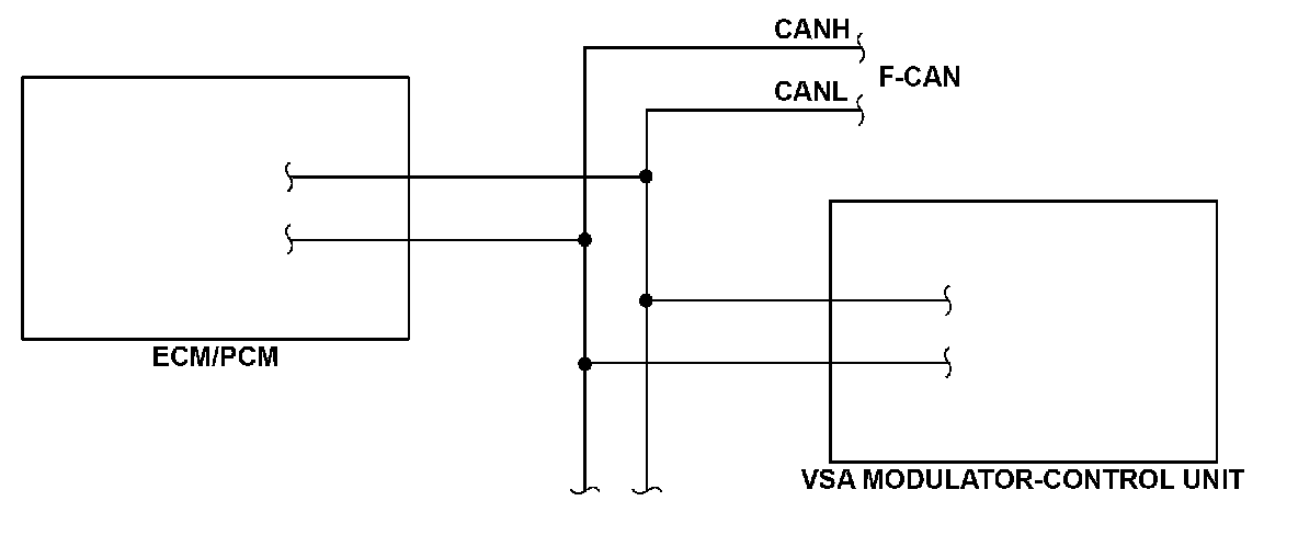 The controller area network (CAN) transmits/receives pulsing signals to/from the control modules simultaneously by using two signal lines (CANH and CANL). When the information is not sent from the VSA modulator-control unit via the F-CAN and this condition continues for a specified time or when the information sent from the VSA modulator-control unit is abnormal and this condition continues for a specified cycle, the engine control module (ECM)/powertrain control module (PCM) detects a malfunction and stores a DTC.