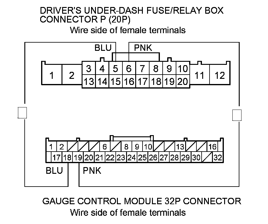 10. Check for continuity between the following terminals of driver's under-dash fuse/relay box connector P (20P), the gauge control module 32P connector, and climate control unit connector B (12P).
