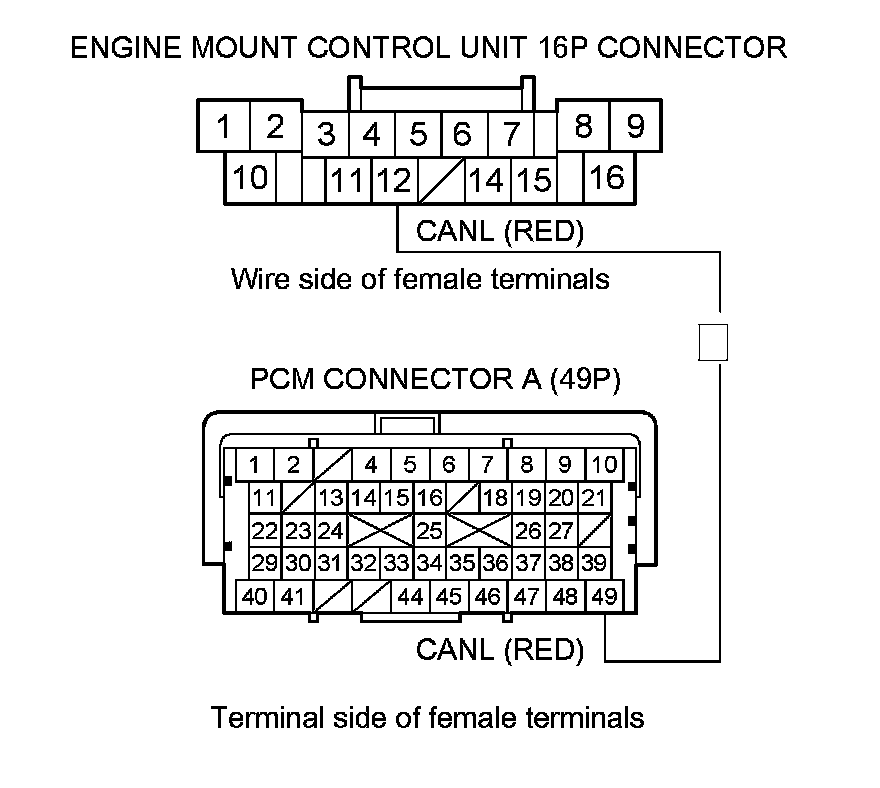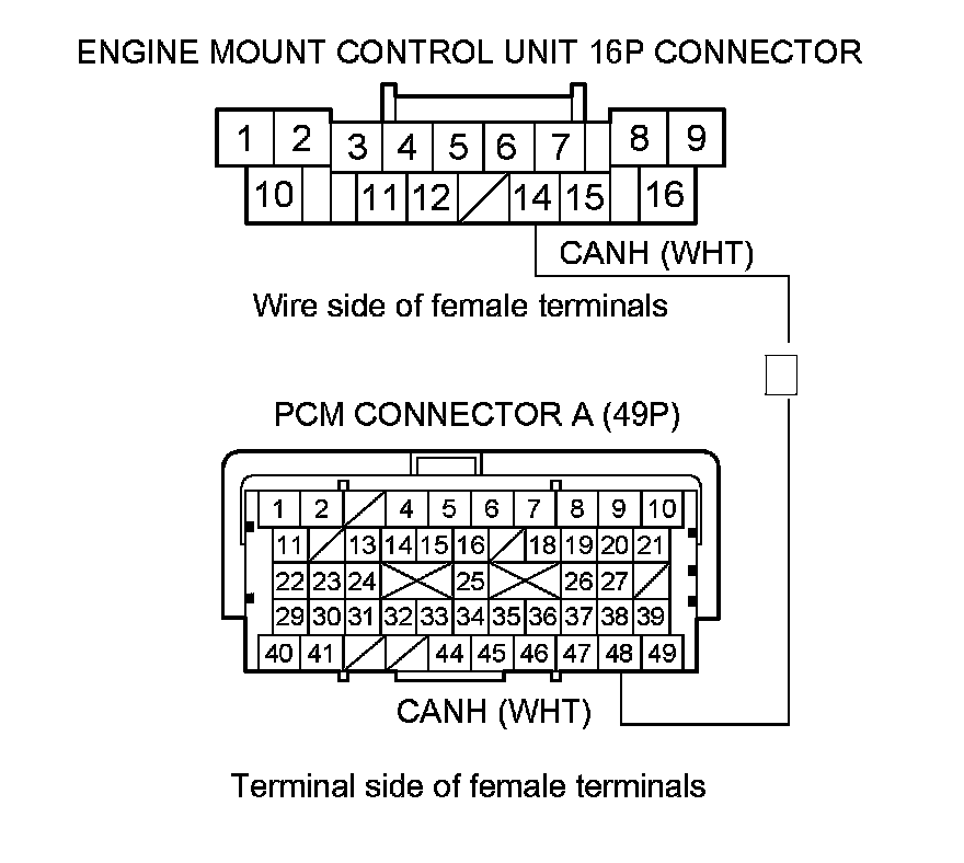 10. Check for continuity between PCM connector terminal A49 and engine mount control unit 16P connector terminal No. 12.