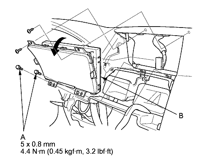 2. Remove the screws and bolts (A), then pull out the navigation display unit (B).