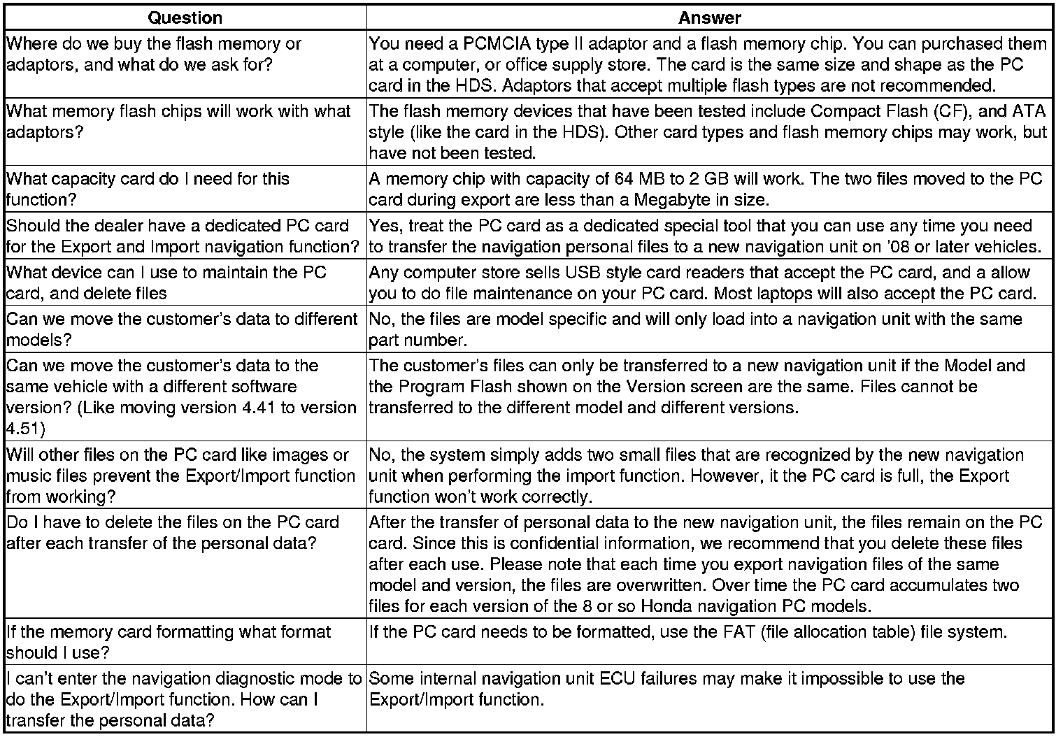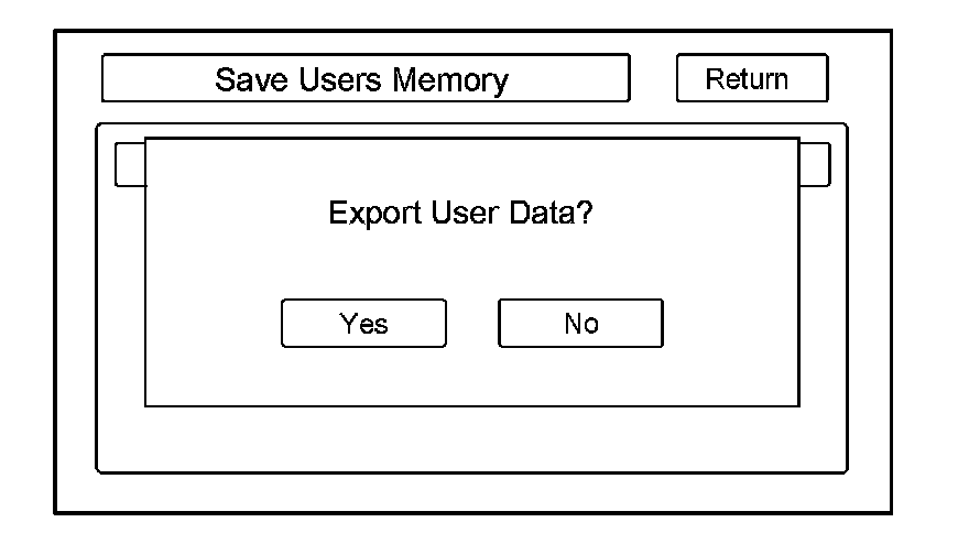 When replacing the navigation unit, this function allows the dealer to transfer the customer's personal data to the new navigation unit. The transferred information includes their Setup settings, and personal addresses. The dealer inserts a PC card to the navigation unit, and then selects the Save Users Memory function. The two functions in this diagnostic screen are EXPORT and IMPORT. EXPORT saves the customer's data to the PC card, and IMPORT moves the PC card files to the new navigation unit.