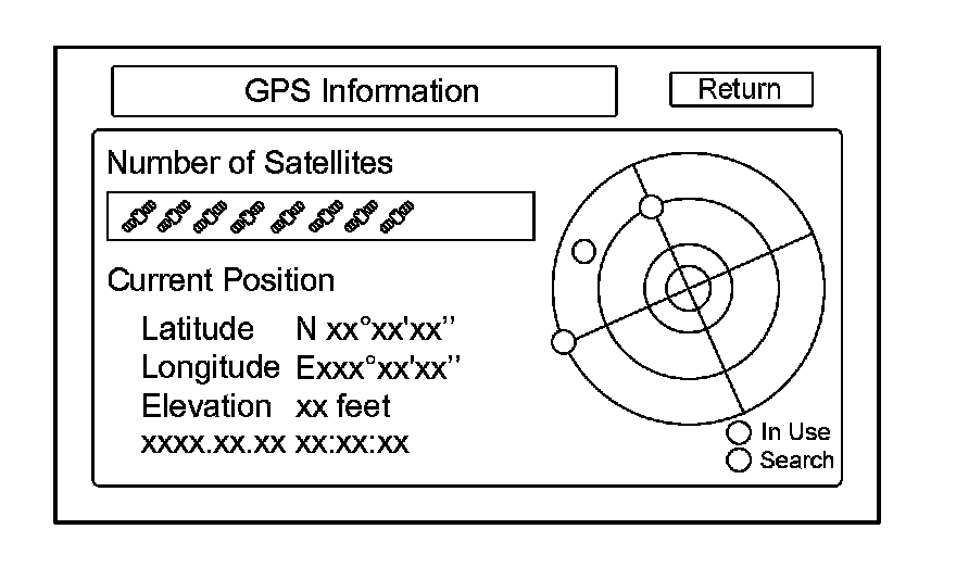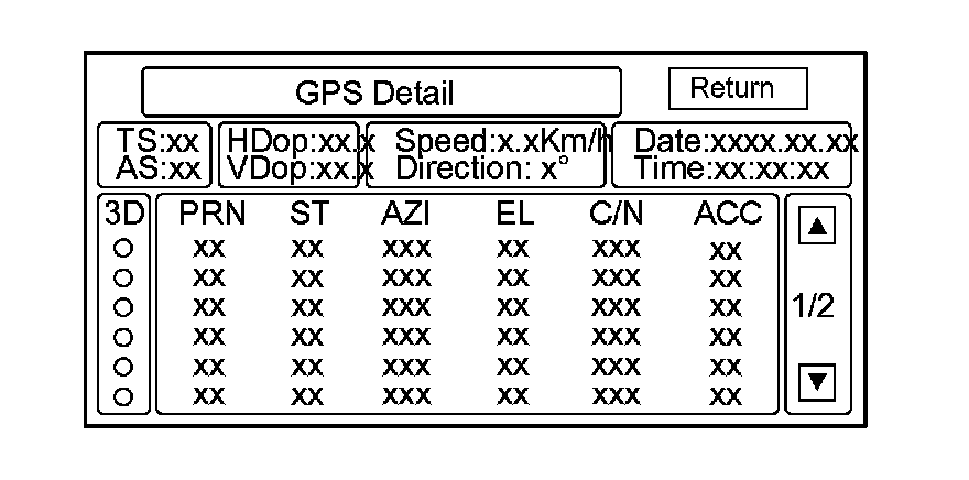 By pressing and holding the MENU button for 2 seconds, a GPS Detail screen appears. This screen displays real time incoming satellite positional data when the vehicle is outside in the open. The information shown on this screen is for factory use.