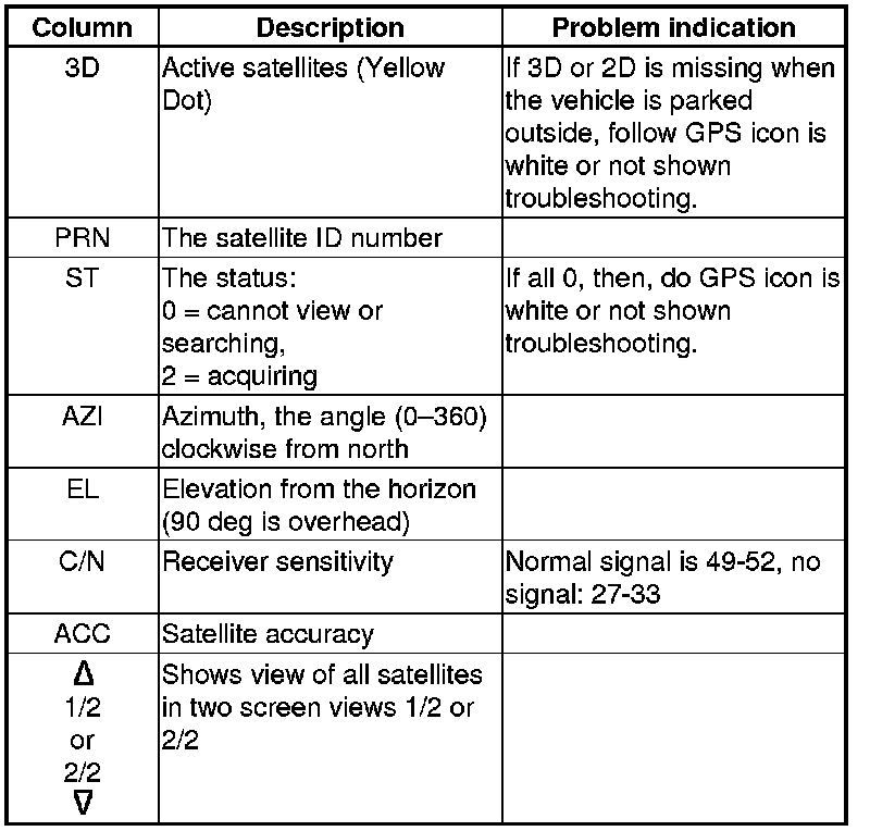 - If the row of data in the table below begins with a yellow dot, the AZI and EL fields can be used to locate each satellite on the circular GPS diagram (see prior screen).
