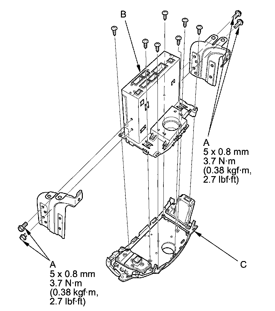 3. Remove the mounting screws and bolts (A) from the audio unit (B), then remove the audio unit from the audio switch panel (C).