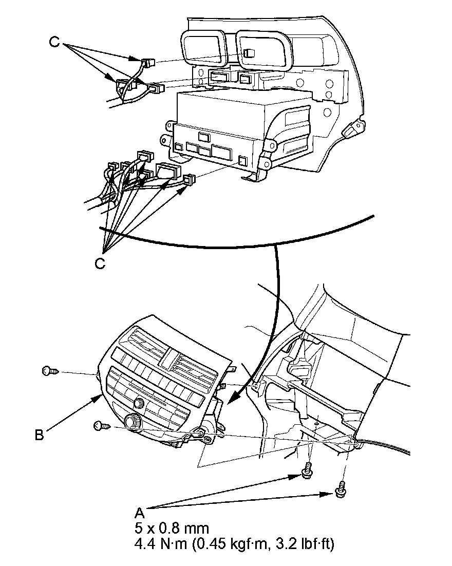 7. Remove the mounting screws and bolts (A) from the audio unit (B), then remove the audio unit from the audio switch panel (C).