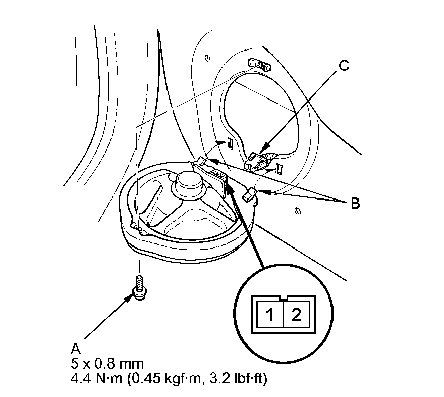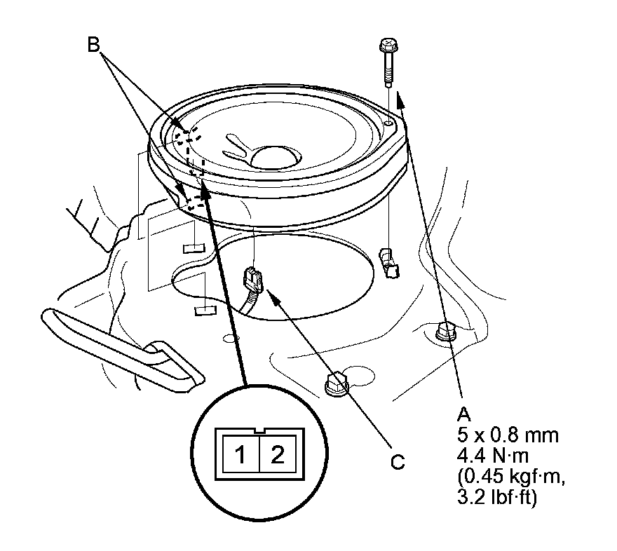 3. Disconnect the 2P connector (C), and remove the rear speaker.