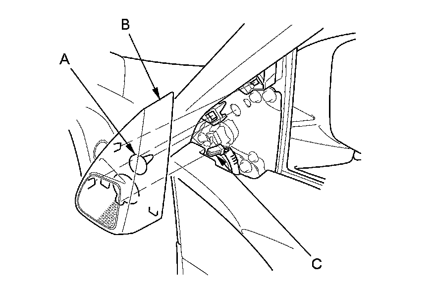 1. Detach the clip (A) and remove the front door tweeter cover (B). Then disconnect the connector (C).