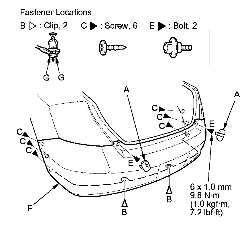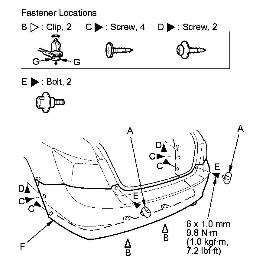 1. Remove the caps (A). Remove the clips (B), the screws (C, D), and the bolts (E) securing the rear bumper (F).