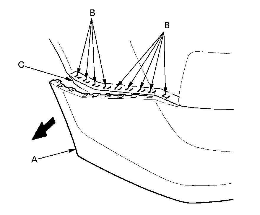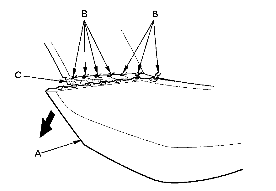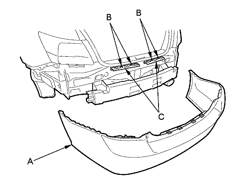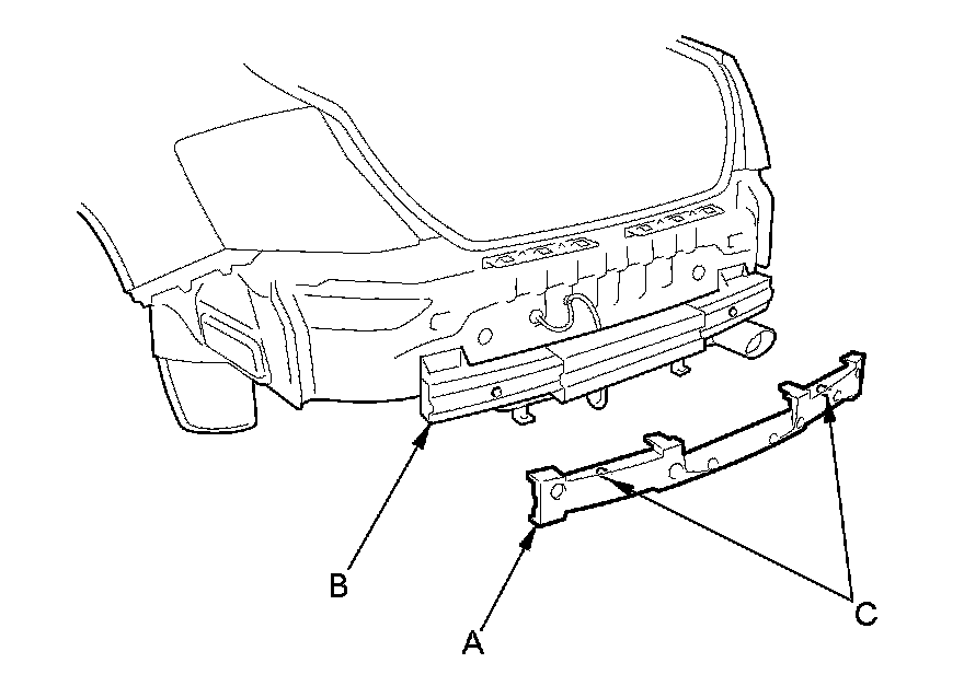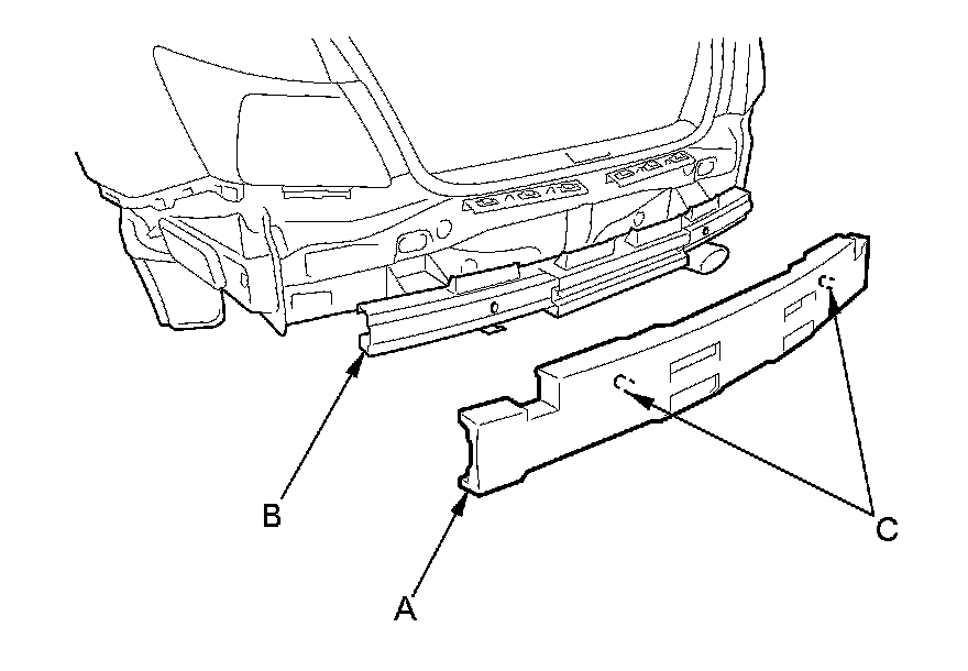 5. If necessary, remove the rear bumper absorber (A) from the rear bumper beam (B) by pulling the absorber to release the posts (C) on both sides.