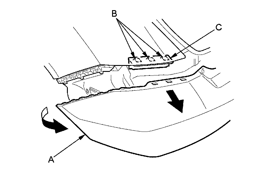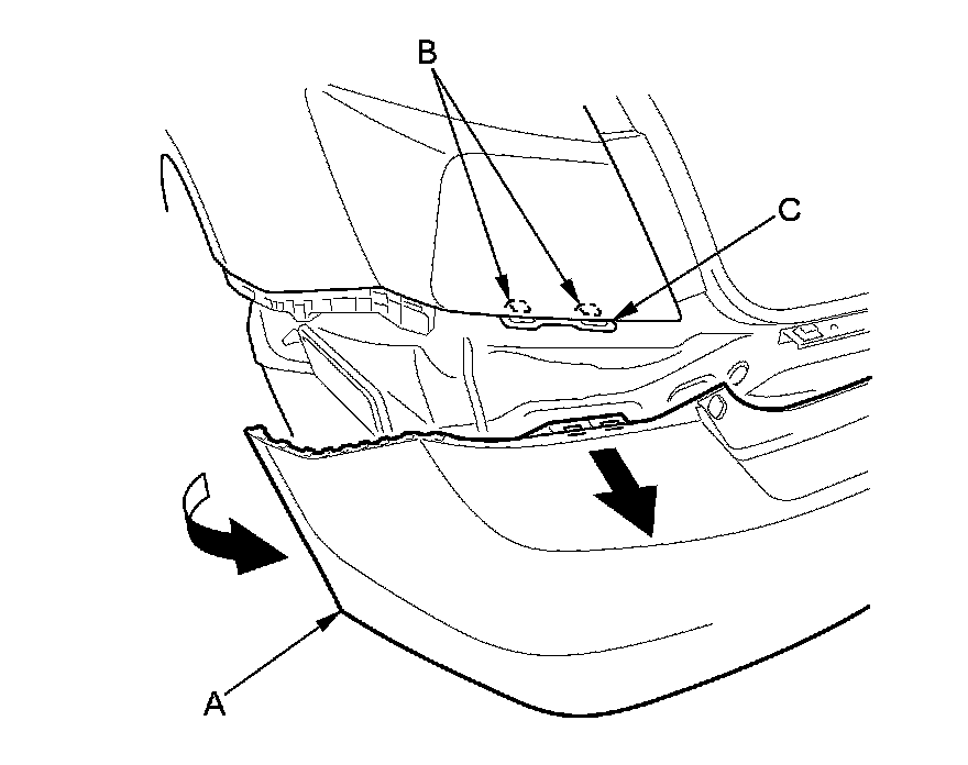 3. With the help of an assistant, pull out one side of the rear bumper (A) to release the hooks (B) on the side bracket (C) as shown. Repeat this step on the opposite side.