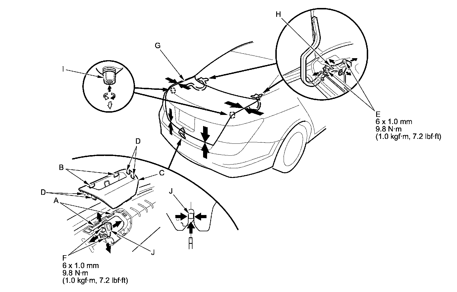4. Adjust the trunk lid (G) alignment in the following sequence: