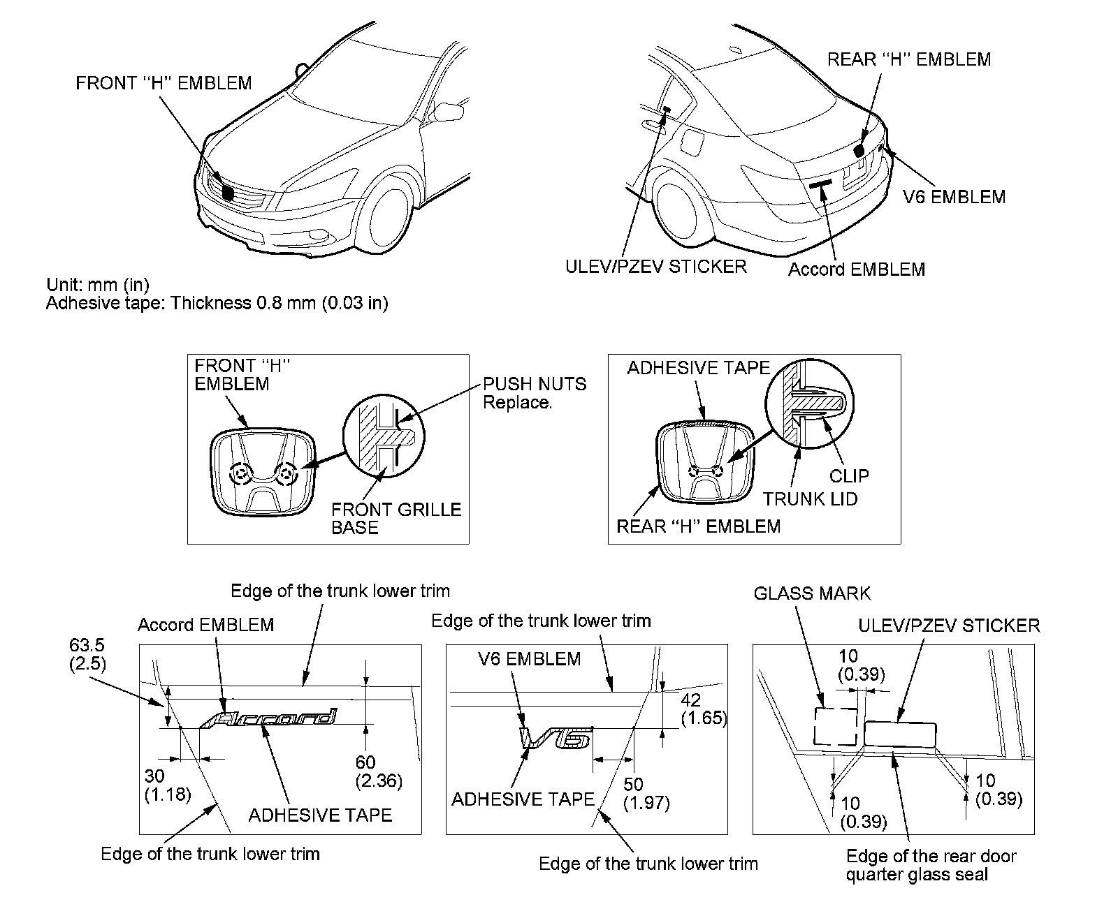 3. Apply the emblems/sticker where shown. When installing the ULEV/PZEV sticker on the inside surface of the left rear door quarter glass, align the sticker with the edge of the glass mark and the rear door quarter glass seal as shown, and press the sticker into place, then remove the application tape.