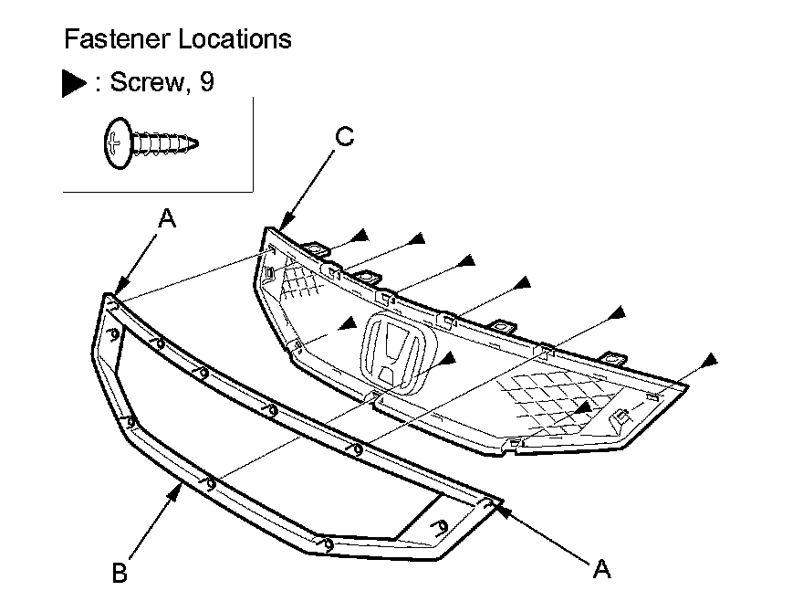 2. Remove the screw, and release the hooks (22 places) (A) with a flat-tip screwdriver, then remove the front grille molding (B) from the front grille base (C).