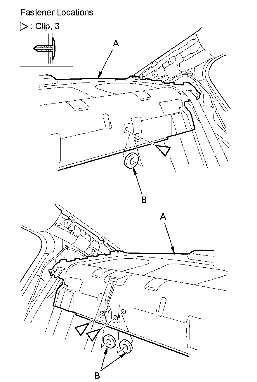 4. Remove the clips securing the rear shelf (A), and remove the washers (B) from between the rear shelf and the body. 4-door is shown; 2-door is similar.