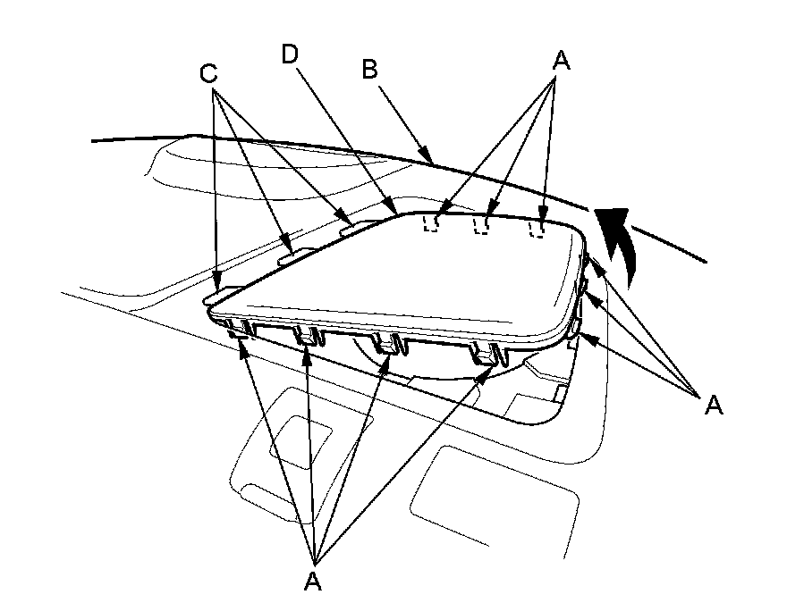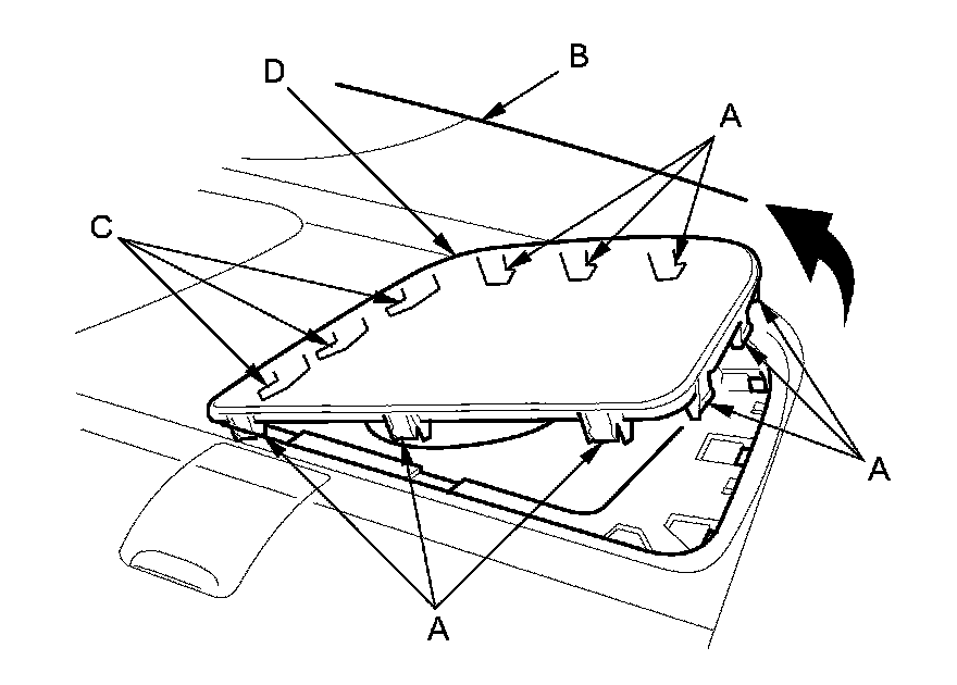 6. If necessary, release the hooks (A) from under the rear shelf (B), and release the hooks (C), then remove the rear speaker grille (D). The left side is shown; the right side is similar.