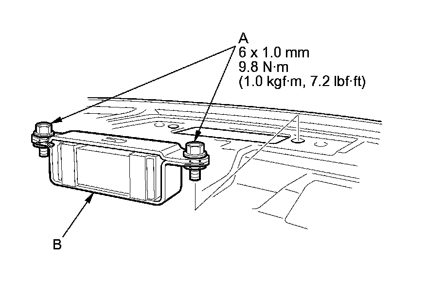 2. Remove the bolts (A), then remove the rear parcel shelf dynamic damper (B). Take care not to hit the rear window when removing the bolts.