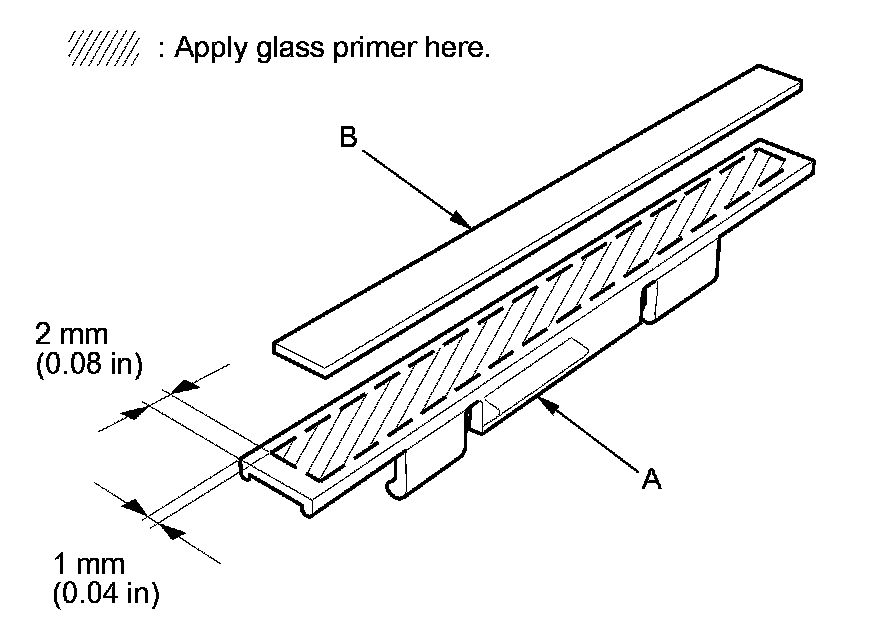 4. If you are reinstalling the old rearview mirror harness cover base (A), scrape off all of old adhesive tape from the base with a putty knife. Clean the base surface with isopropyl alcohol. Apply primer to the base as shown, and attach adhesive tape (B) to the base.