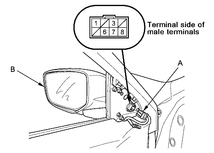 2. Disconnect the 8P connector (A) from the power mirror actuator (B).