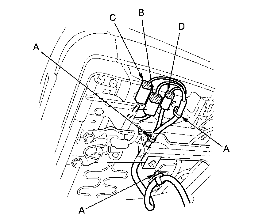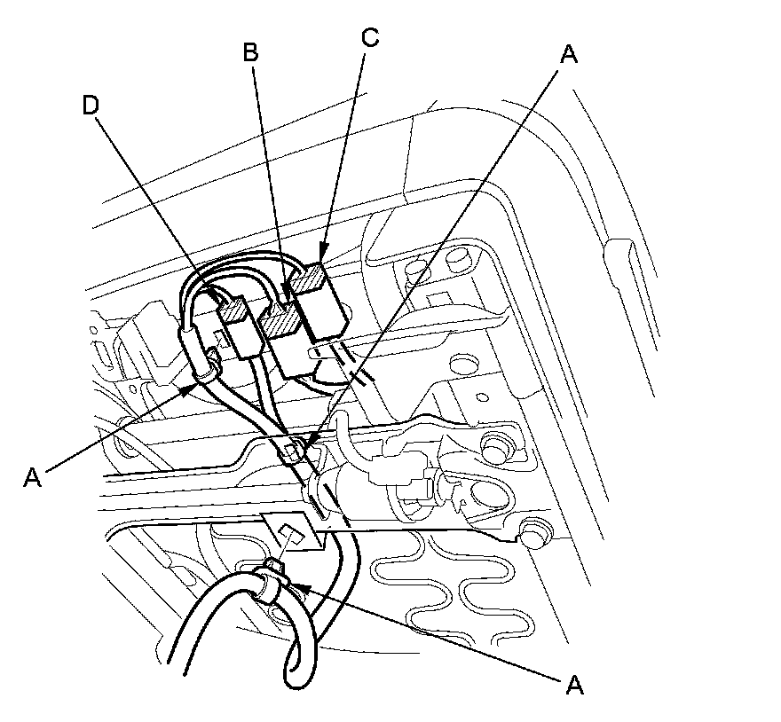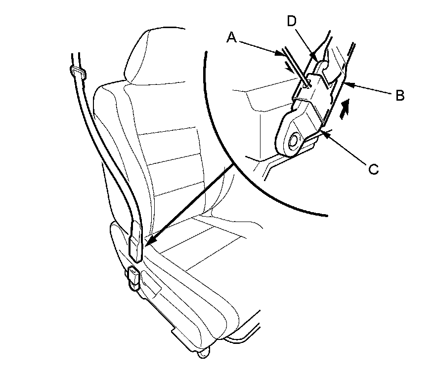 2. 2-door passenger's seat: Carefully insert the tip of a small screwdriver (A) through the hole in the back of the front seat belt lower anchor cover (B), and into the hole in the front seat belt lower anchor (C). Unlock the lower anchor by pushing in on the screwdriver. Remove the screwdriver, and then detach the front seat belt anchor plate (D) and the anchor cover from the lower anchor.