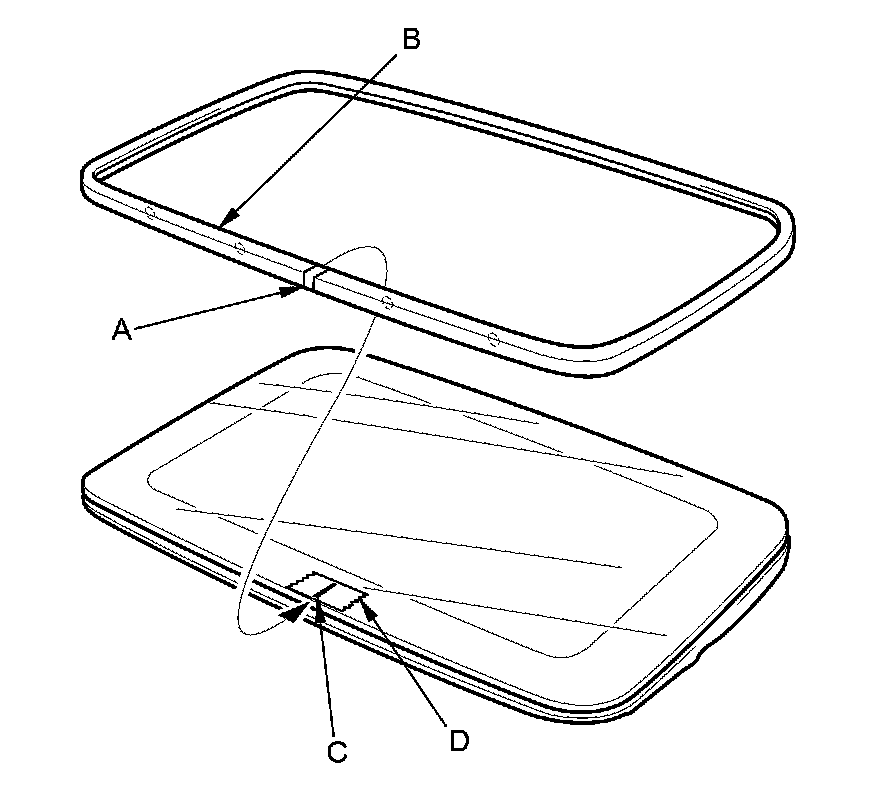 5. Align the seam (A) of the new weatherstrip (B) to the mark (C) on the masking tape (D). Make sure the holes are pointed in the same direction as noted in step 4.