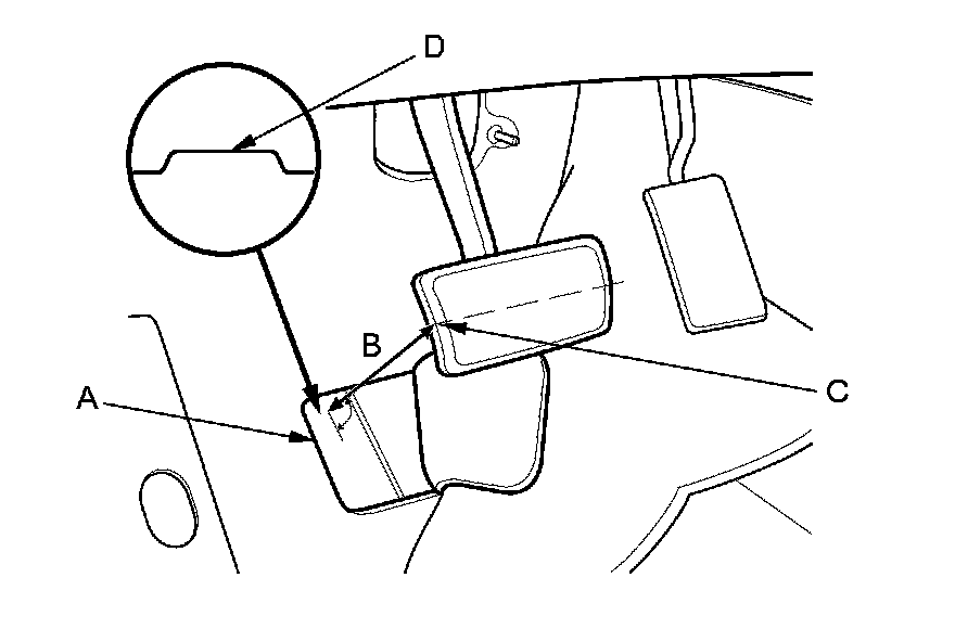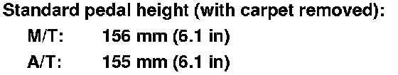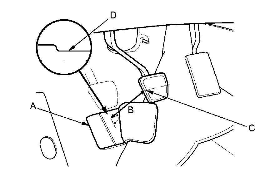 4. Pull back the carpet, and find the cutout (A) in the insulation. Measure the pedal height (B) from left side middle of the brake pedal pad (C) to the floor (D) without the insulation as shown.