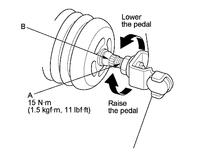 5. Loosen the pushrod locknut (A), and screw the pushrod (B) in or out with pliers until the standard pedal height from the floor is reached. After adjustment, tighten the locknut firmly. Do not adjust the pedal height with the pushrod pressed.