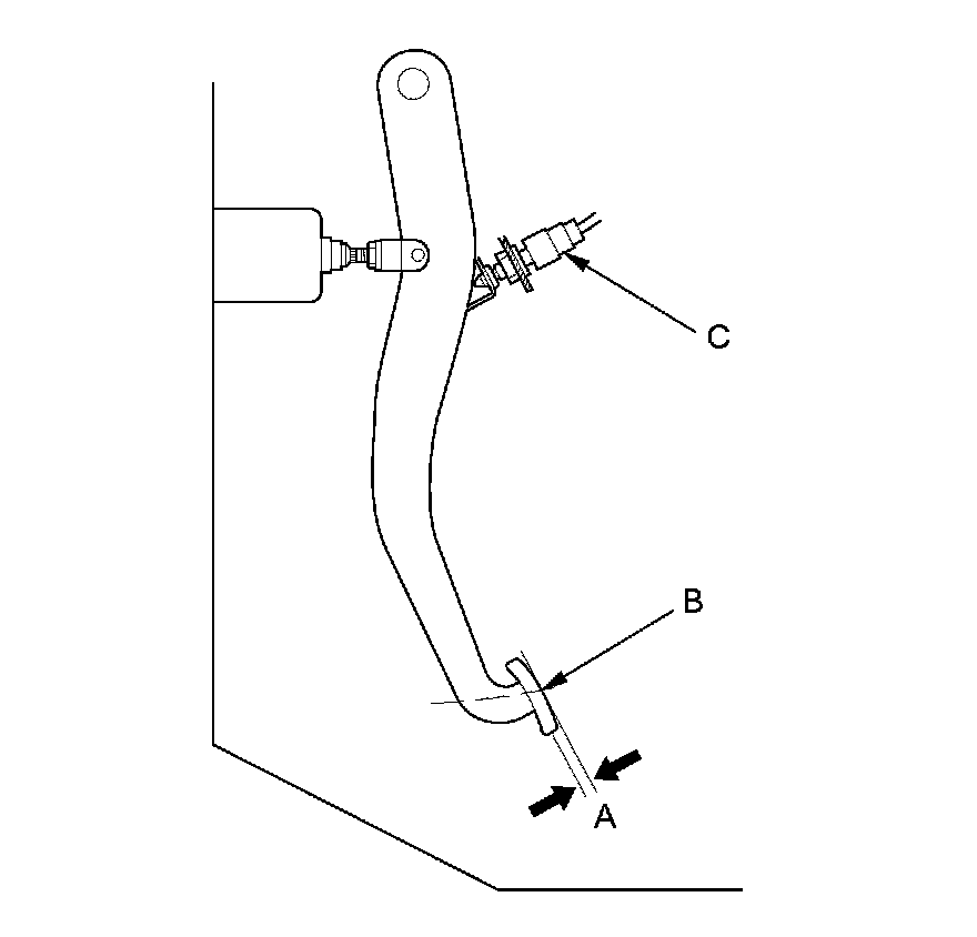 1. With the ignition switch in LOCK (0), inspect the free play (A) at the pedal pad (B) by pushing the brake pedal by hand. If the brake pedal free play is out of specification, adjust the brake pedal position switch (C). If the brake pedal free play is insufficient, it may result in brake drag.