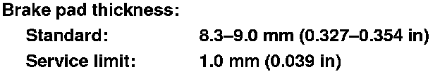 4. If any part of the brake pad thickness is less than the service limit, replace the brake pads as a set.