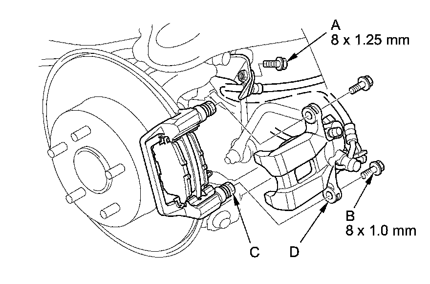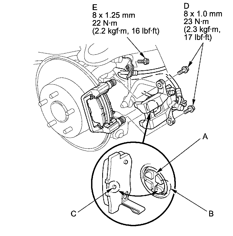 17. Install the caliper body. Install the flange bolts (D), and tighten it to the specified torque while holding the respective caliper pins with a wrench being careful not to damage the pin boots and parking brake cable boot.
