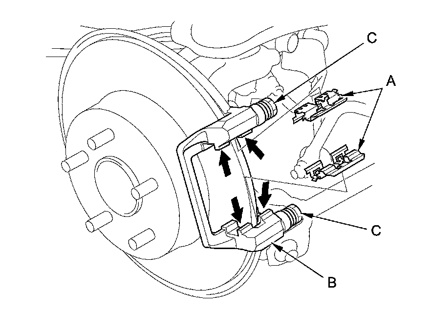 14. Install the brake pads and pad shim correctly. Install the brake pad with the wear indicator (C) on the bottom inside position. If you are reusing the brake pads, always reinstall the brake pads in their original positions to prevent a temporary loss of braking efficiency.