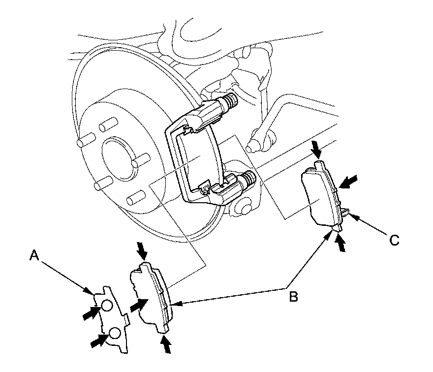 3. Check the thickness (A) of the inner pad (B) and the outer pad (C). Do not include the thickness of the backing plate.