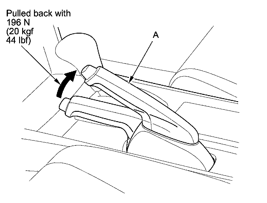 1. Pull the parking brake lever (A) with 196 N (20 kgf, 44 lbf) of force to fully apply the parking brake. The parking brake lever should be locked within the specified number of clicks.