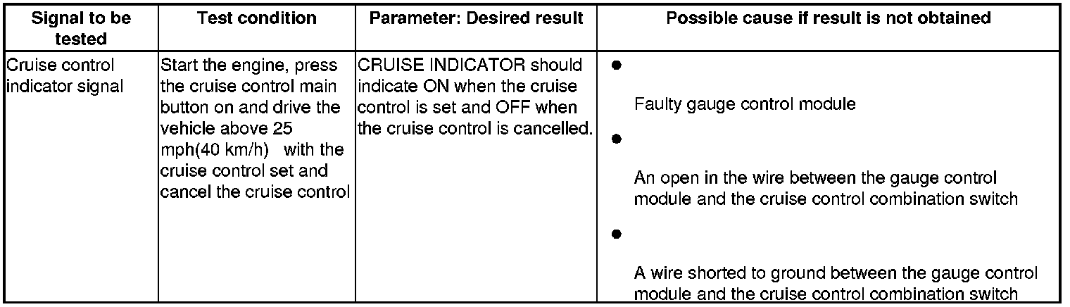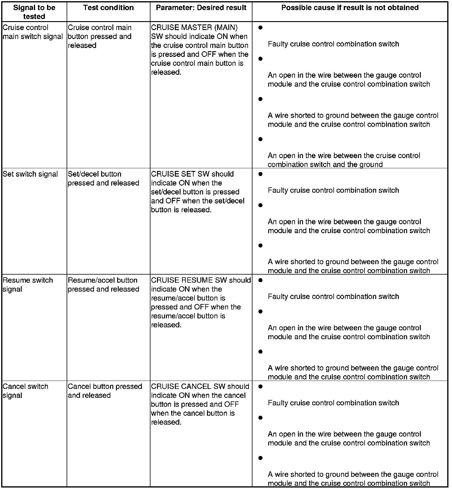 NOTE: Intermittent failures are often caused by loose circuit connections. While monitoring cruise control inputs, flex the circuit wires, and note if any of the test results change.