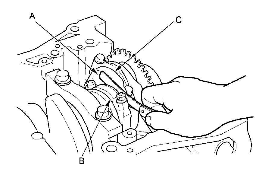 3. Measure the connecting rod end play with a feeler gauge (A) between the connecting rod (B) and the crankshaft (C).