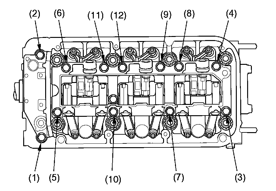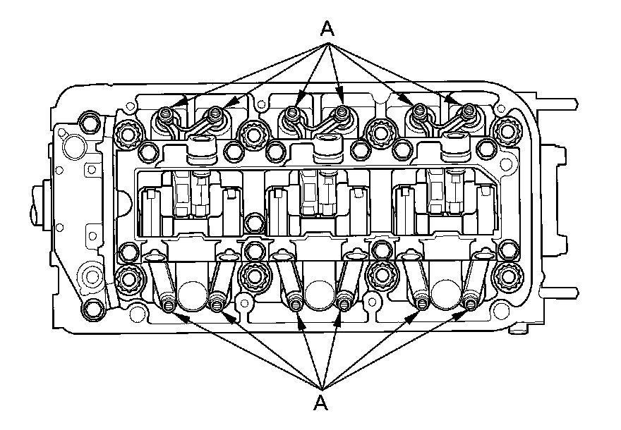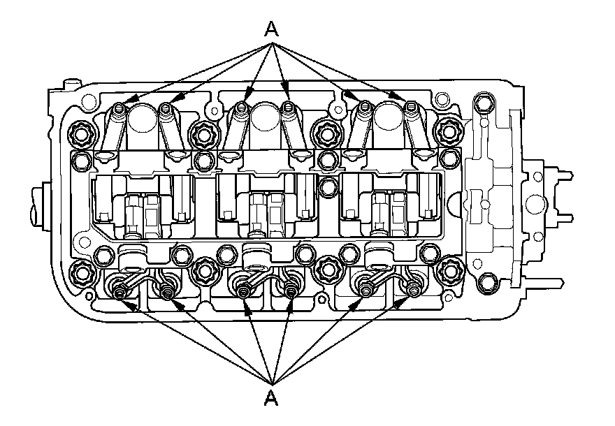 2. When removing the rocker arm assembly, do not remove the rocker shaft bridge mounting bolts and the rocker shaft holder mounting bolts. The bolts will keep the rocker arms on the shafts.