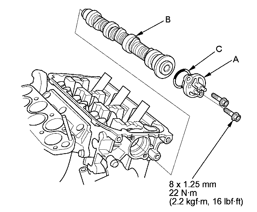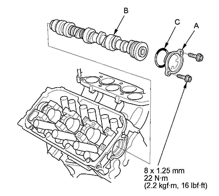 11. Install the rear camshaft in the reverse order of removal. Always use a new O-ring (C). Apply new engine oil to the journals and the cam lobes.