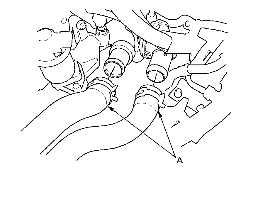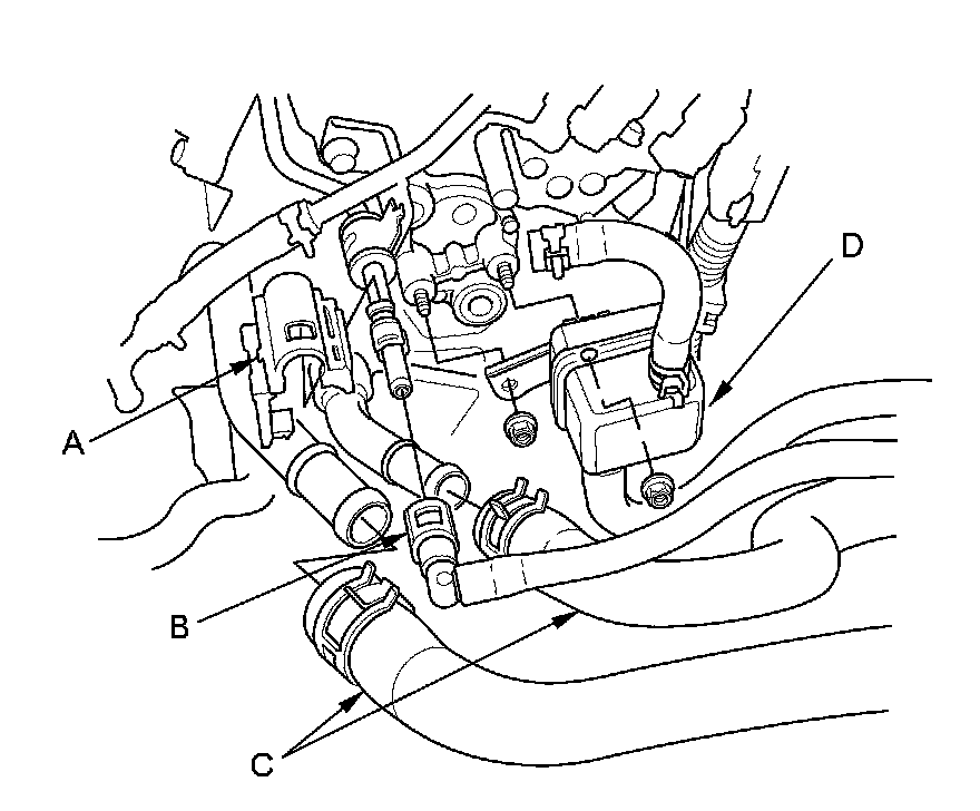 6. Disconnect the heater hoses (C) and remove the evaporative emission (EVAP) canister purge joint (D) with the bracket.