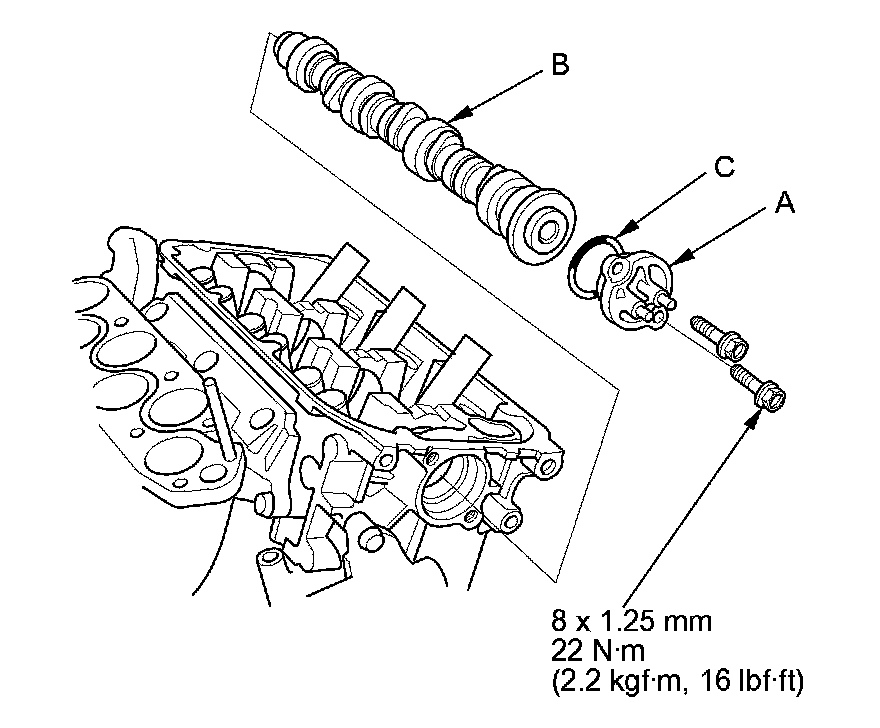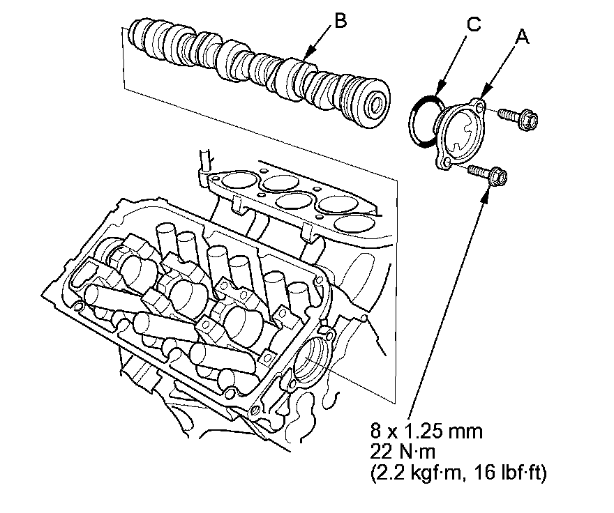 11. Install the rear camshaft in the reverse order of removal. Always use a new O-ring (C). Apply new engine oil to the journals and the cam lobes.