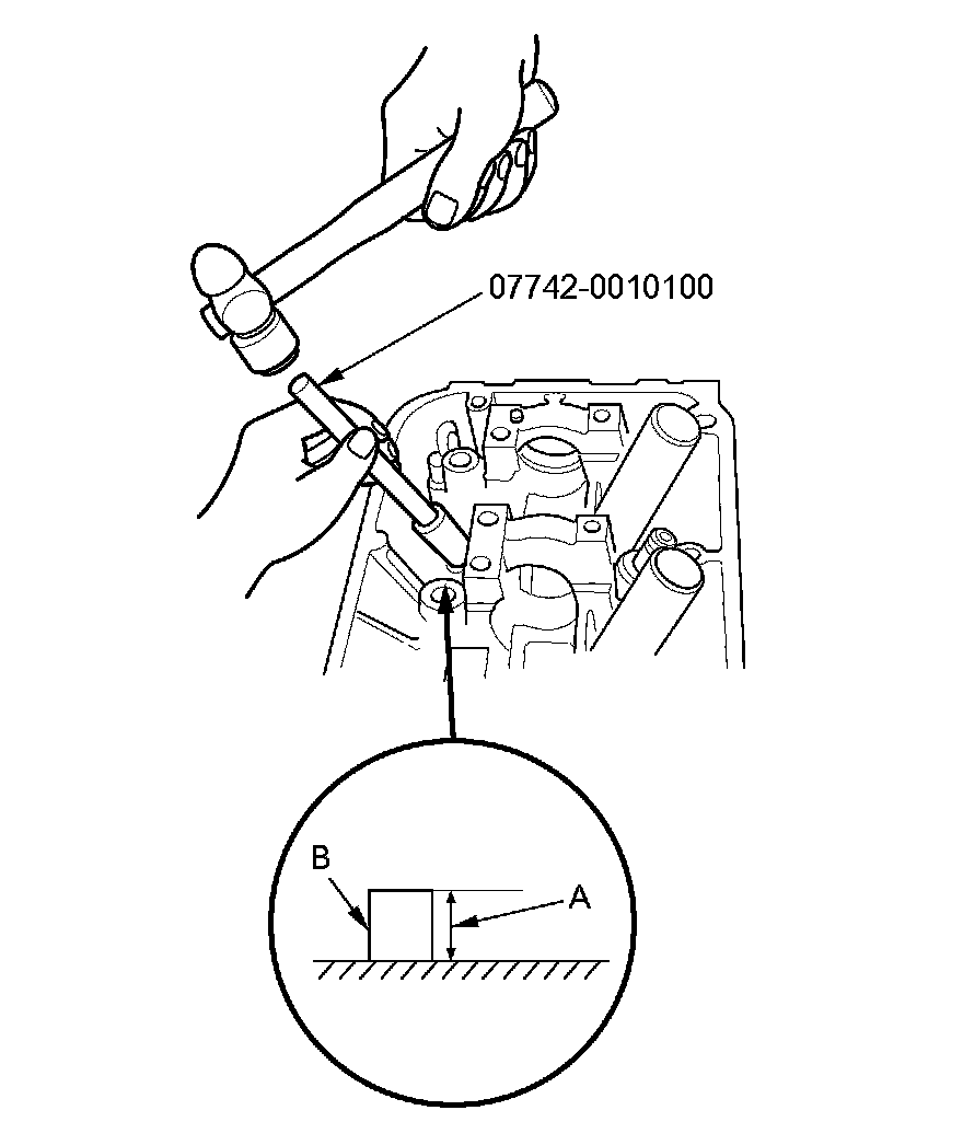 9. Apply a thin coat of new engine oil to the outside of the new valve guide. Install the guide from the camshaft side of the head; use the valve guide driver, 5.35 x 9.7 mm to drive the guide to the specified installed height (A) of the guide (B). If you have all 12 guides to do, you may have to reheat the head.