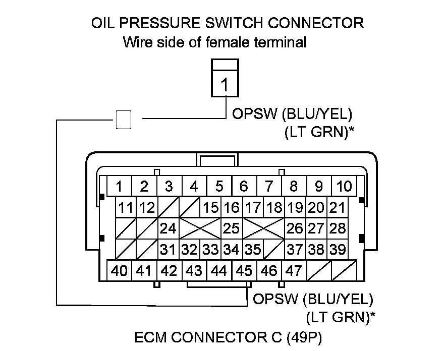 10. Check for continuity between ECM connector terminal C45 and the oil pressure switch connector.