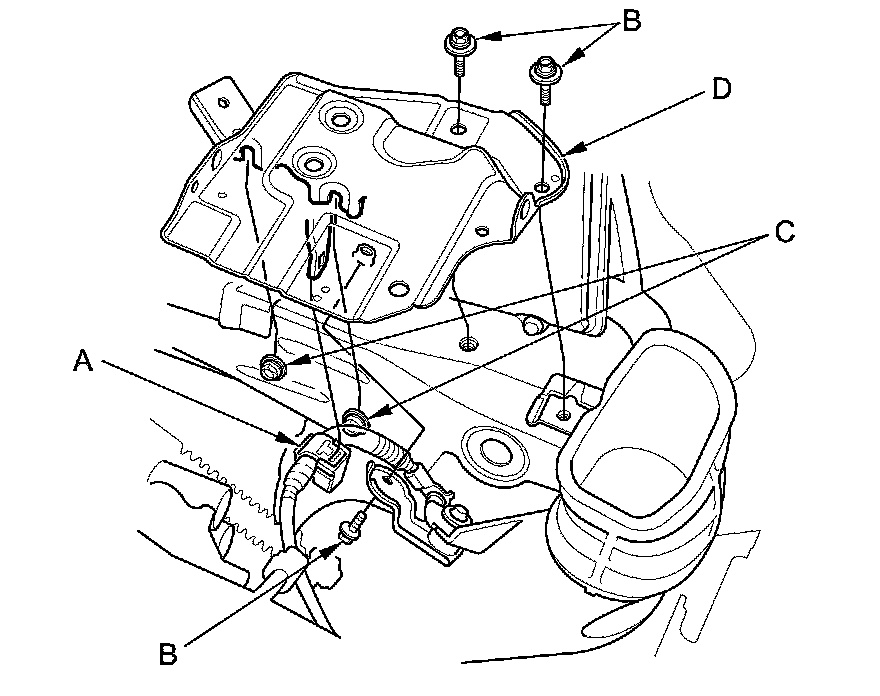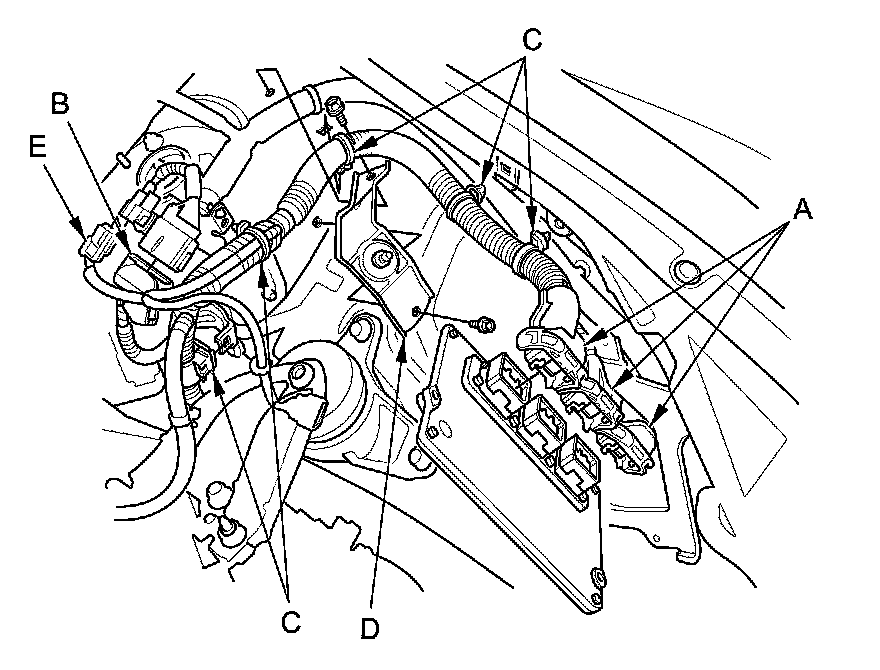 13. Disconnect the ECM/PCM connectors (A) and the engine wire harness connector (B), then remove the harness clamps (C) and the bracket (D).