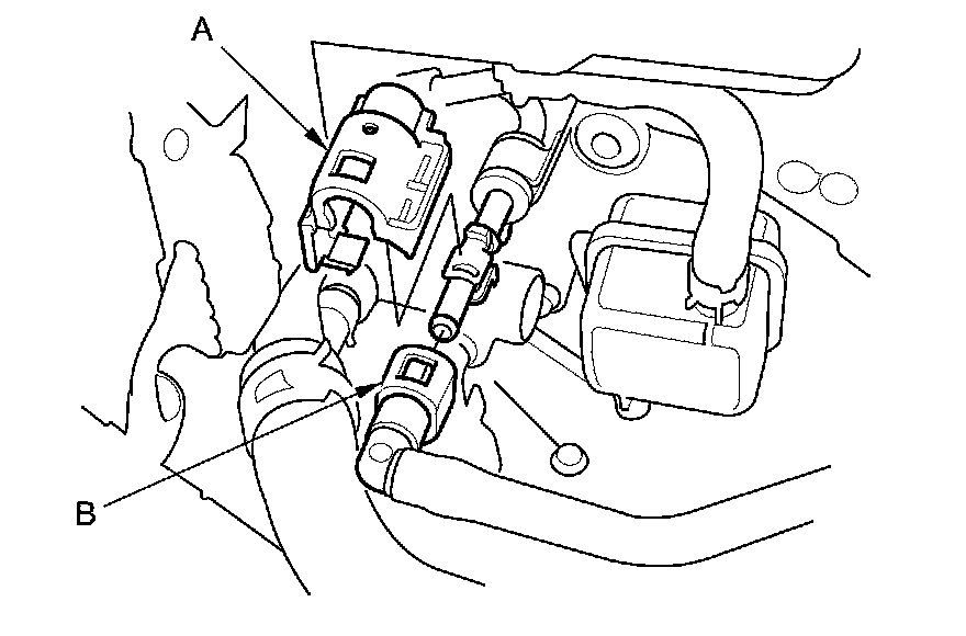 15. Disconnect the EVAP canister hose (A) and the brake booster vacuum hose (B).