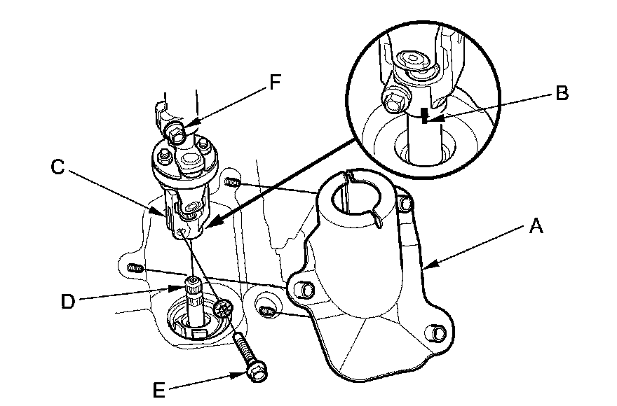 21. Make a reference mark (B) across the steering joint (C) and the steering gearbox pinion shaft (D). Remove the steering joint bolt (E), and loosen the steering joint bolt (F), then disconnect the steering joint from the steering gearbox pinion shaft.